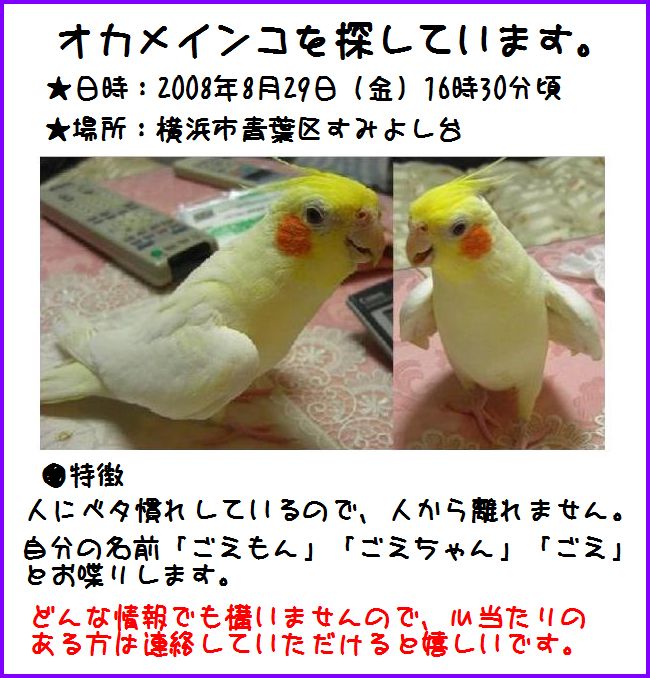 ●2008年8月29日に家族の不注意(肩に乗せたままベランダへ)で外の世界へ飛んでいってしまいました。