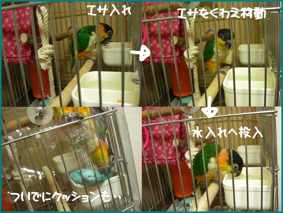 奥にあるエサ箱から手前の水入れまでクチバシに2,3粒入れて