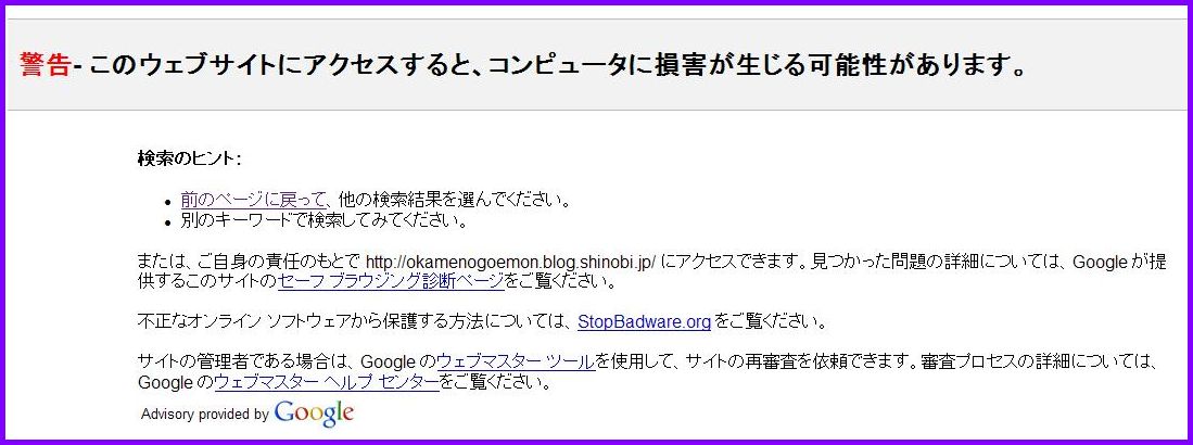 「このサイトはコンピュータに損害を与える可能性があります。」