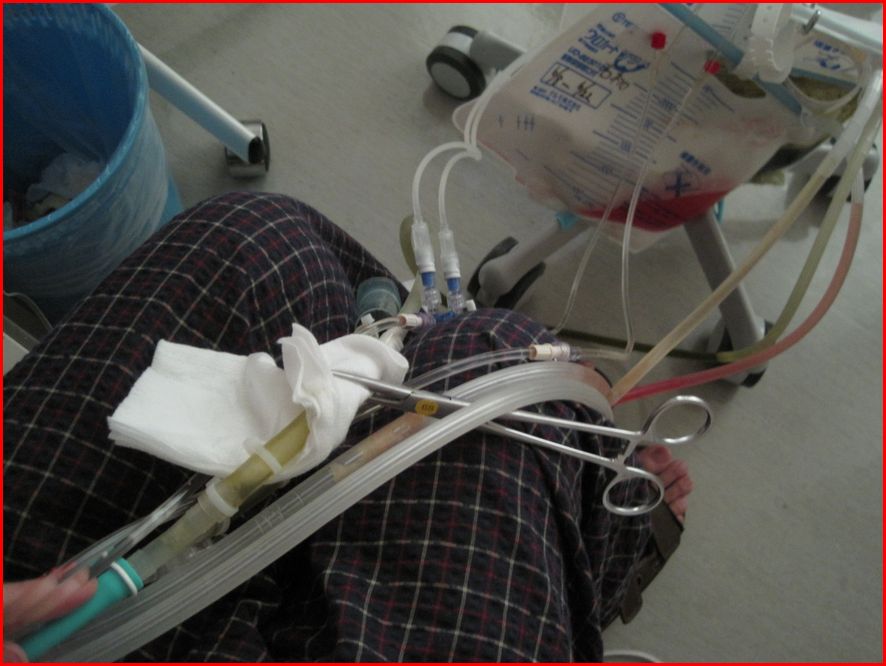 イレウス管(鼻から小腸まで入ってる管) →ウロガードという蓄尿パックに接続。
