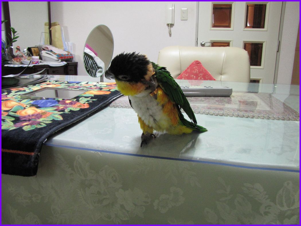 以前はテーブルから飛んでも風切り羽が無いのですぐに失速し床に着地していたのですが・・・・